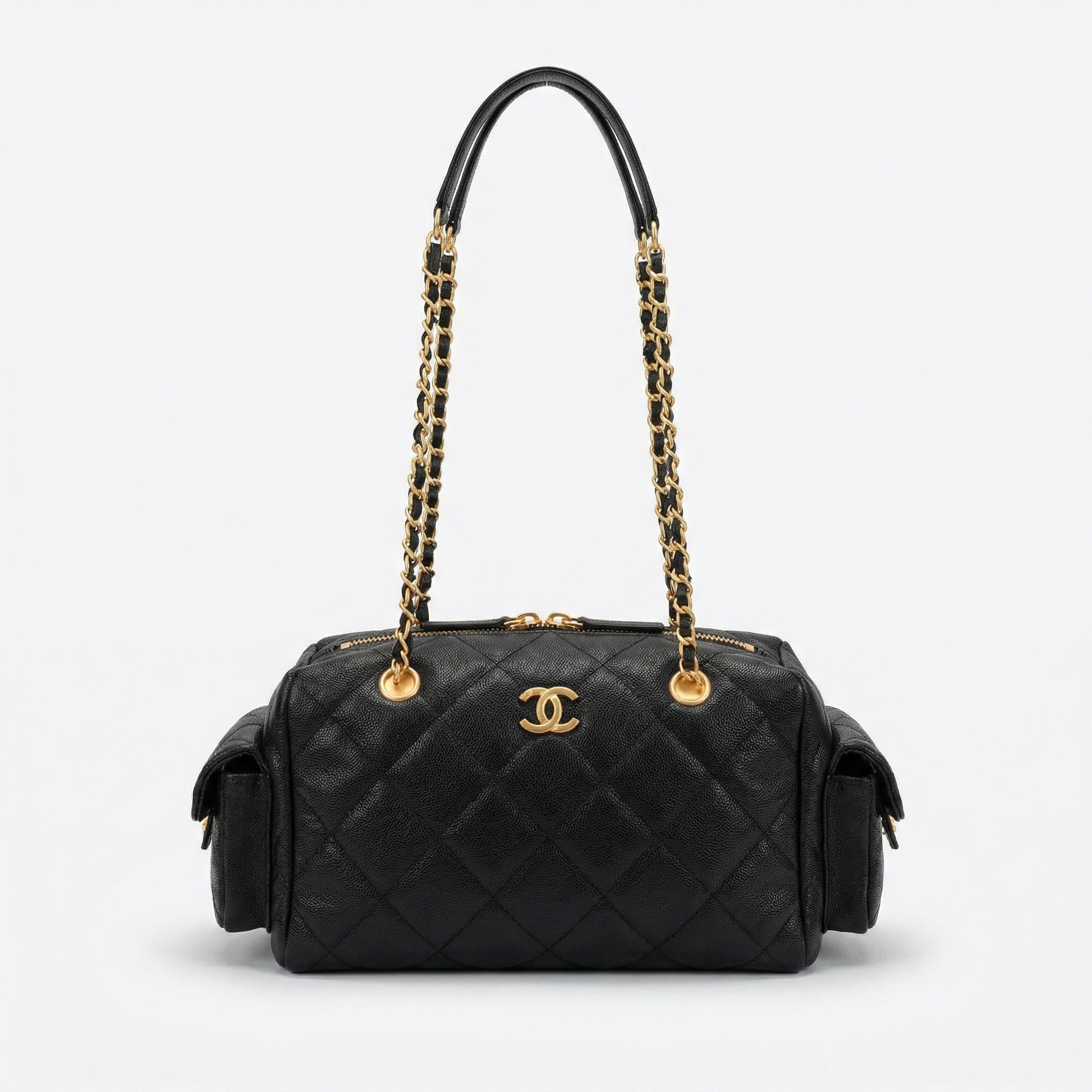 Ce sac bowling Chanel réinterprète une silhouette classique avec le prestige indissociable de la Maison. Confectionné dans un cuir grainé d'une robustesse, il arbore le matelassage en losanges signature et un double C doré en relief. Ses poches latérales à rabat et sa double bandoulière chaîne entrelacée de cuir en font l'accessoire idéal pour celles qui recherchent un volume généreux sans sacrifier l'allure couture.